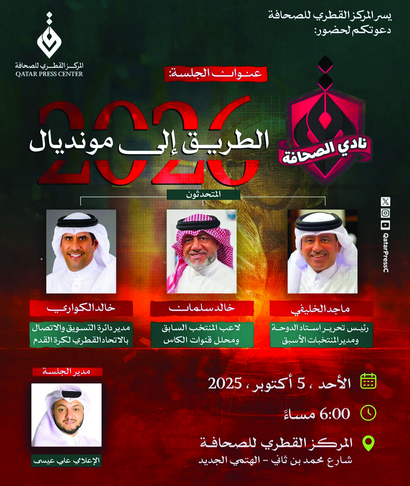 الدوحة- الراية: ينظّمُ غدًا المركز القطري للصحافة جلسةً جديدةً من نادي الصّحافة تحت عنوان: “الطريق إلى مونديال 2026”، وذلك عند الساعة السَّادسة مساءً، بمقرّ المركز.